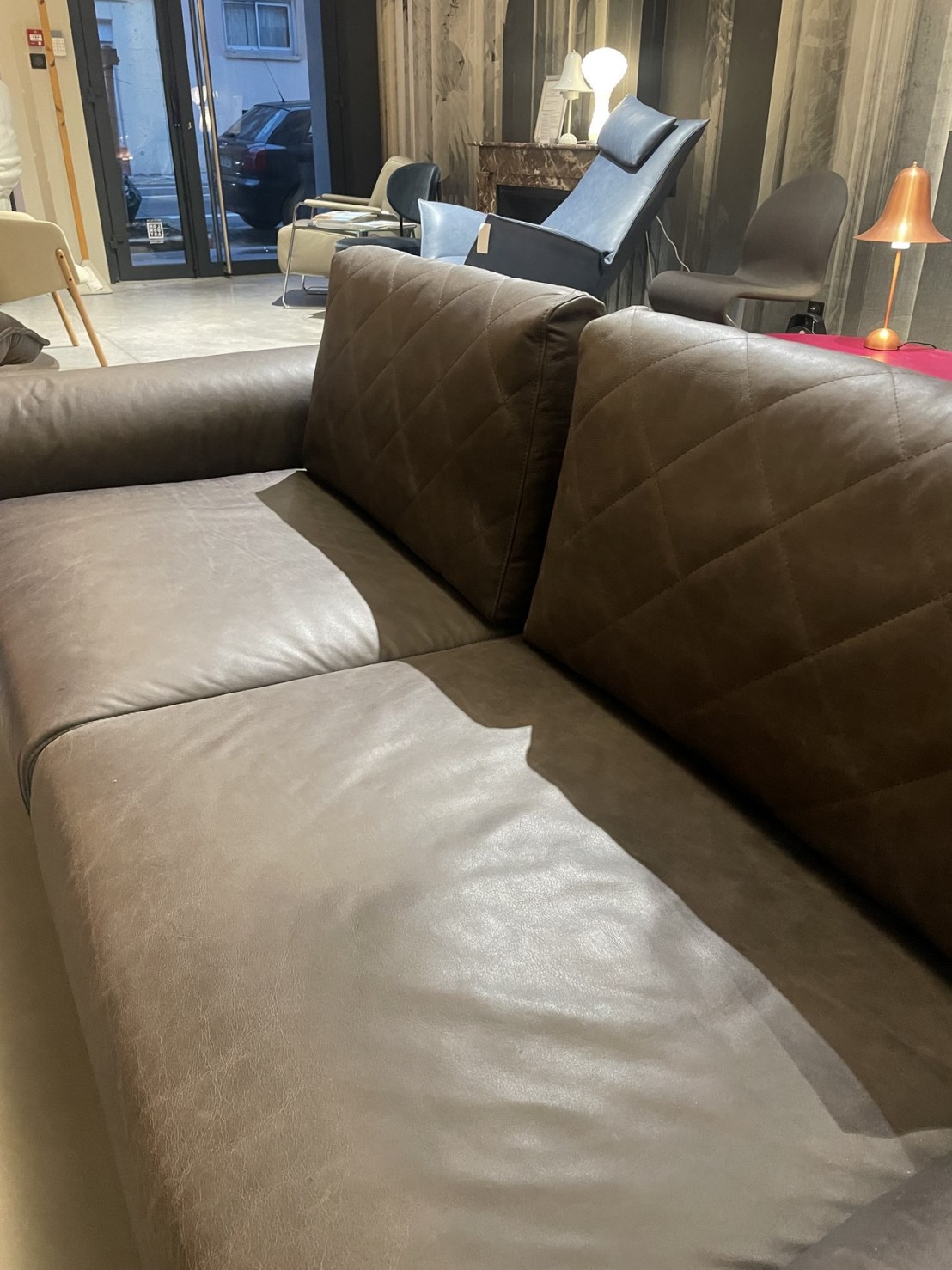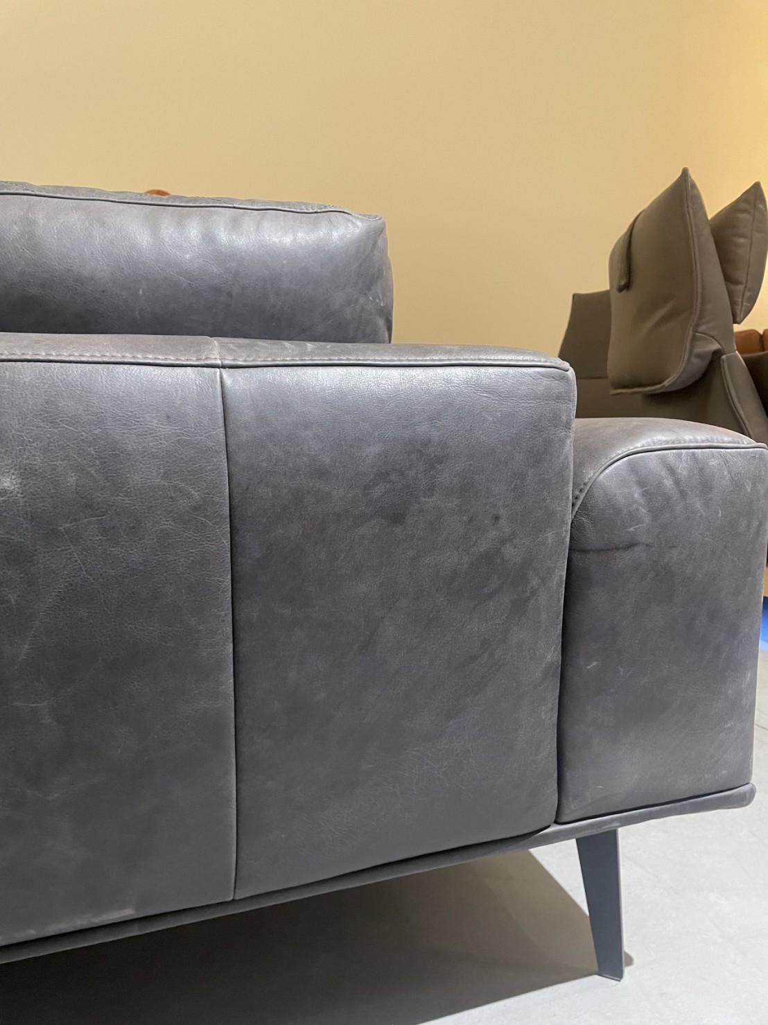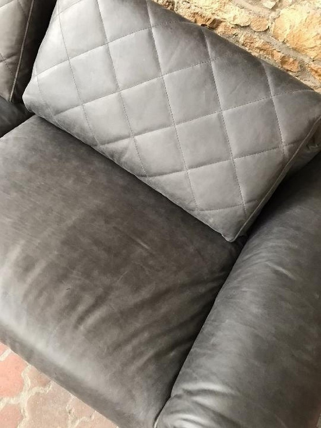 Canapé contemporain 2,5 places JOHN.B en cuir pleine fleur Deluxe 2 Vintage waxed ciré gris foncé graphit, pieds design en acier teinte noir.