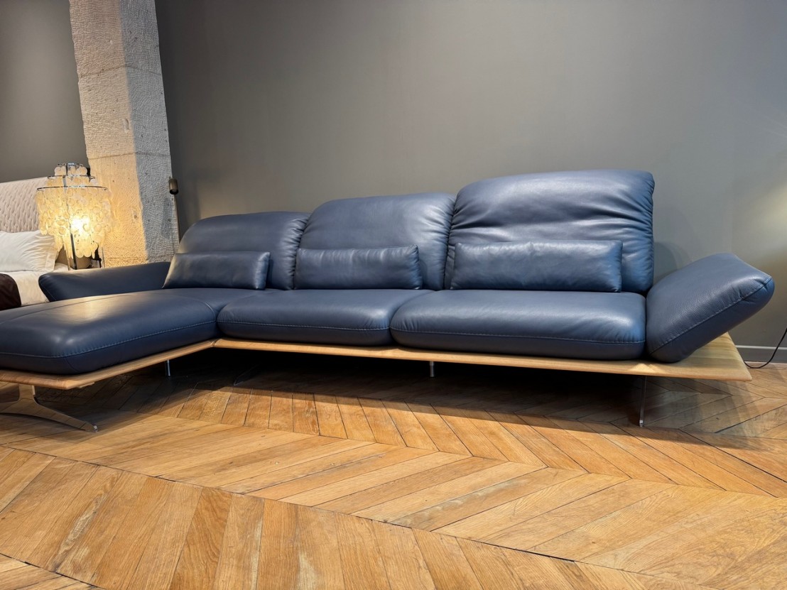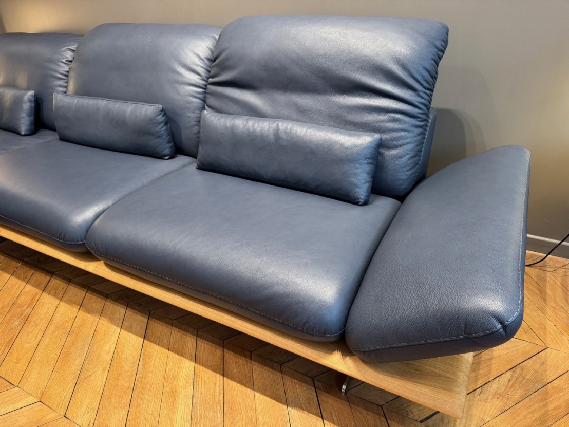 Canapé ATEMPTATION d’angle 5 places & ses 3 coussins cale-reins en cuir pleine fleur Deluxe 2 Ultra Royal Blue, design novateur sur banc en bois de chêne massif naturel huilé, appuies-tête et accoudoirs multi-positions, pieds métal chromé brillant.