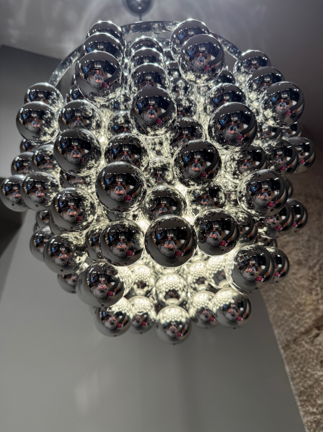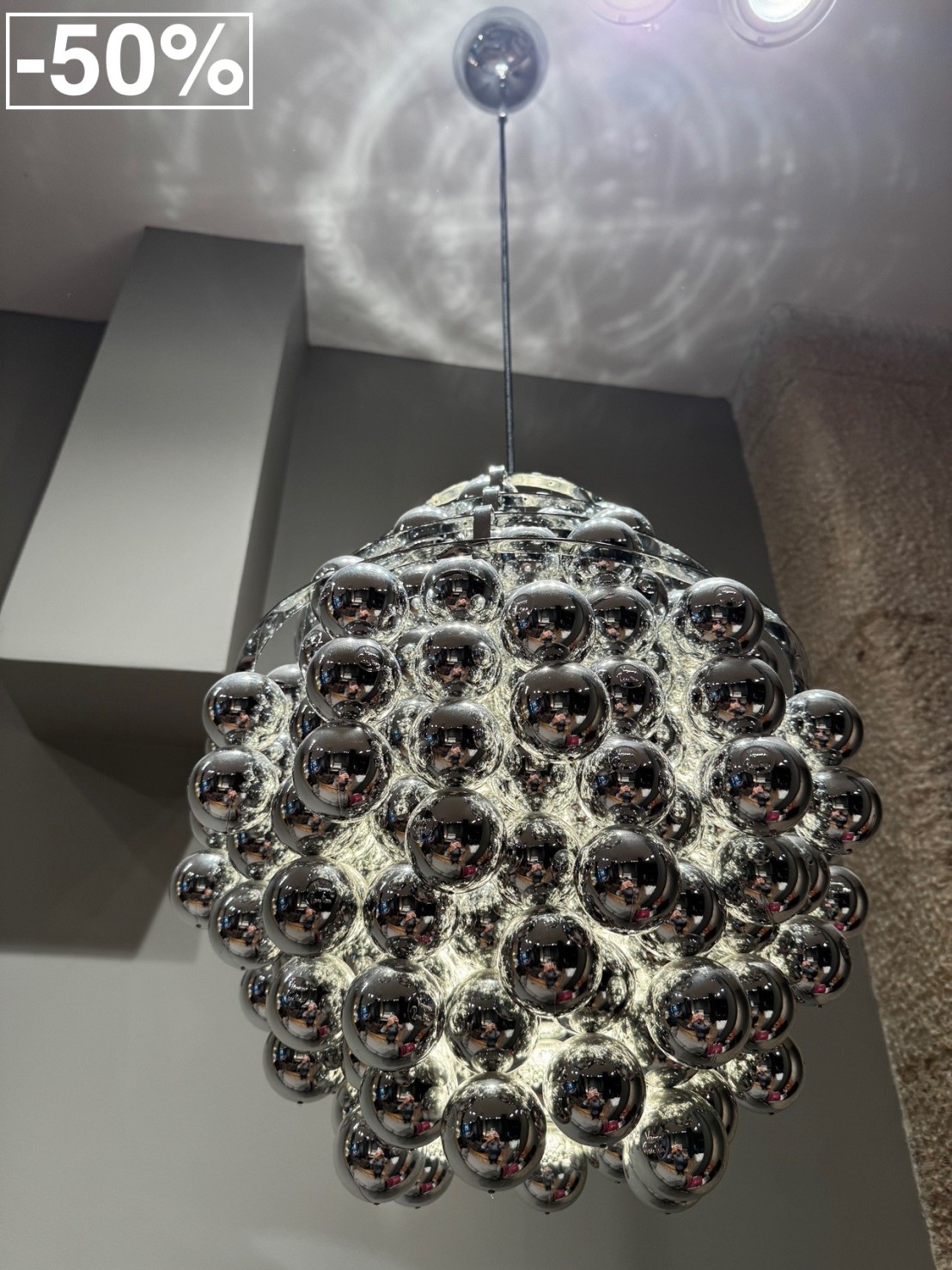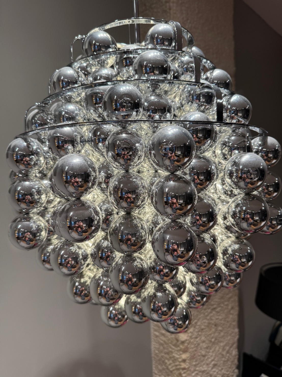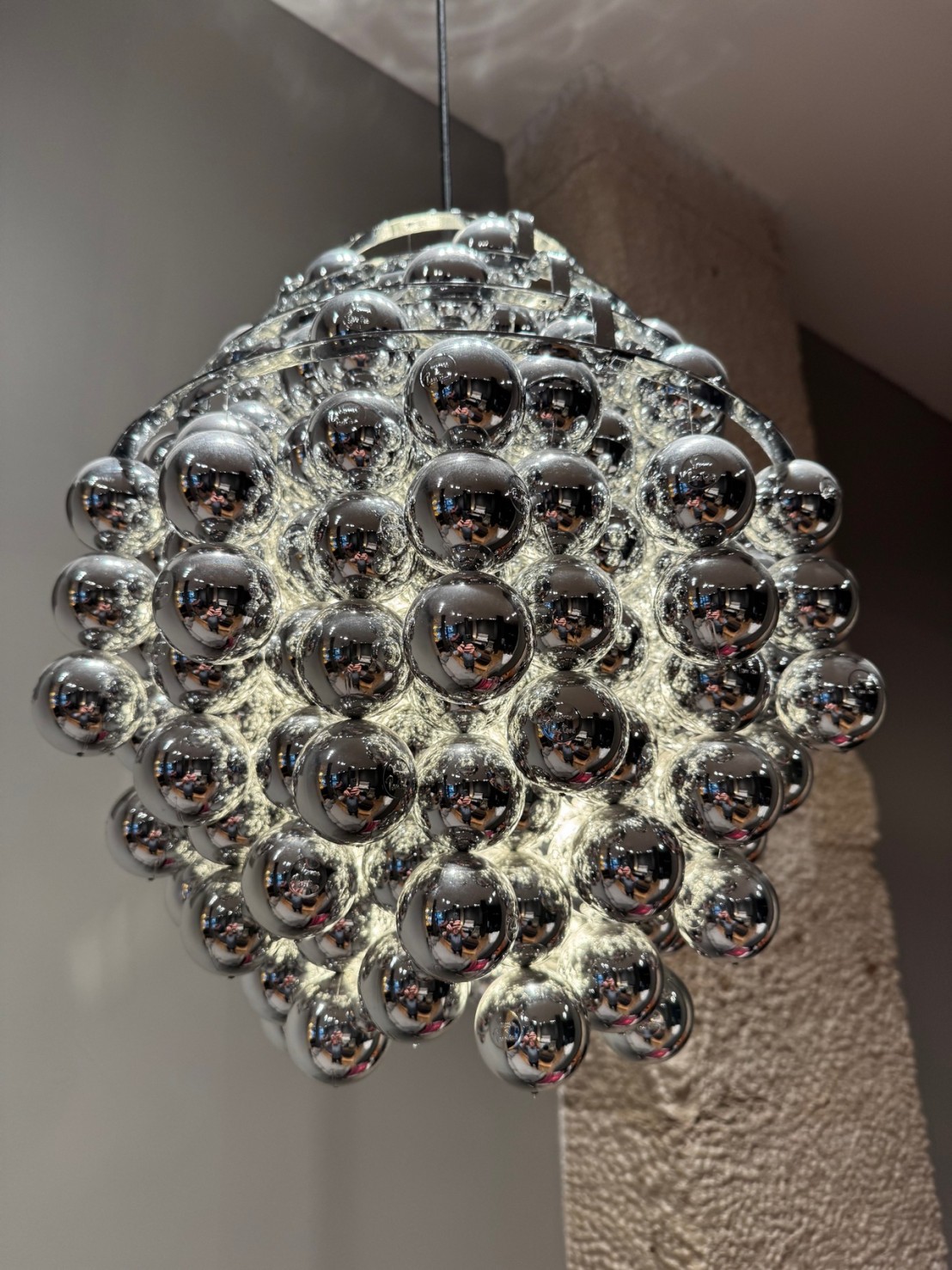 Suspension Verpan Ball argent, lampe Verner Panton originale 1969, livrée avec certificat d'authenticité, diamètre 44 cm, 45 cm de haut, composée de balles en résine de céllidor argentée et d’une structure de 4 anneaux métalliques, cordon noir en tissu, ampoule BC (fournie) : 1 x 60W max E27/E26 - 220V.