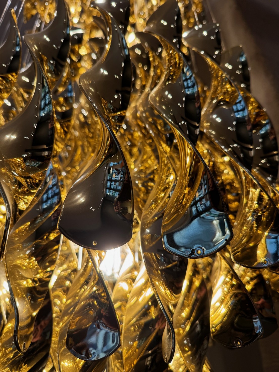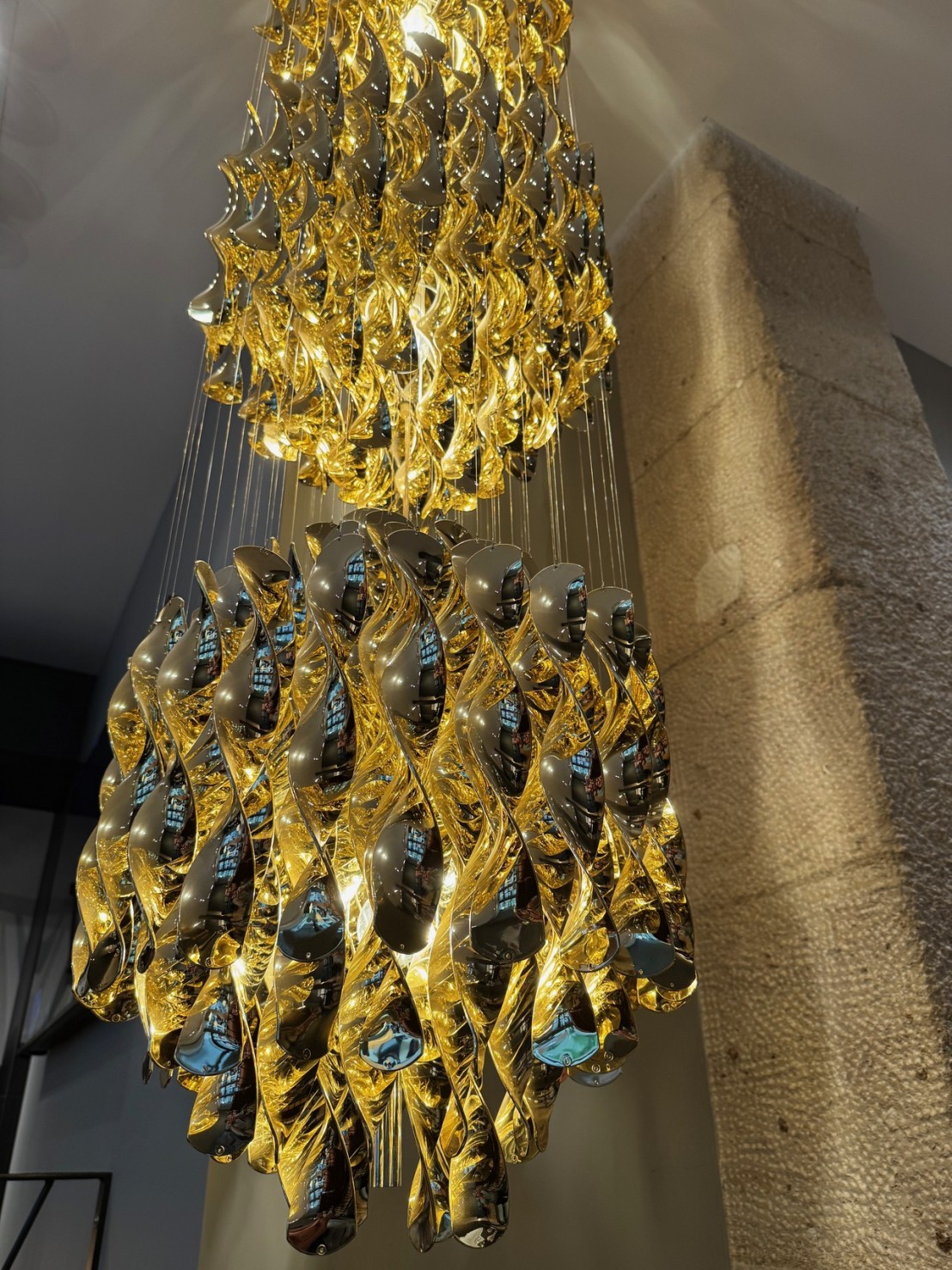 Plafonnier design SP3 Verpan résine de céllidor dorée, lampe Verner Panton originale 1969, avec certificat d'authenticité, diamètre 48 cm, 220 cm de haut, 3 sphères, 3 ampoules BC (fournies) : 3 x 60W max E27/E26 - 220V.