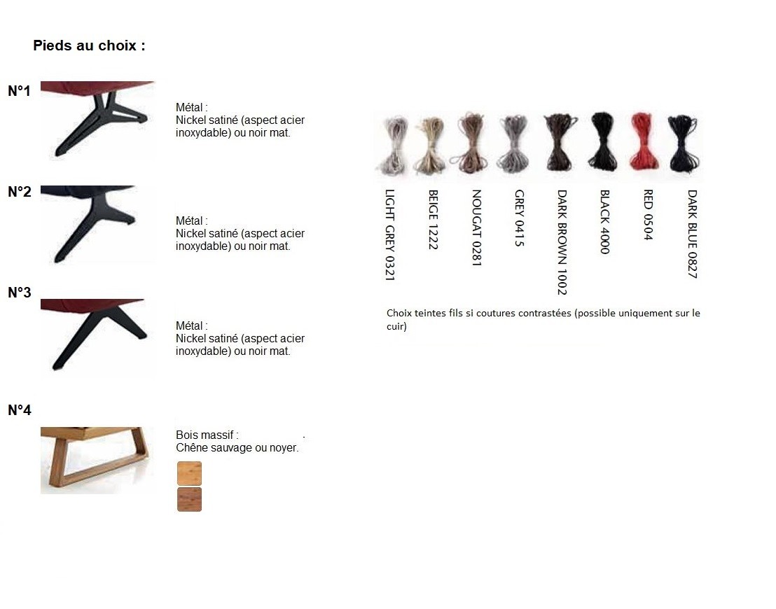 Lors de votre commande, après vous être enregistré, veuillez préciser dans la rubrique « nous laisser un message », le choix du cuir ou tissu, la couture ton sur ton ou contrastée pour le cuir, si contrastée, préciser la couleur du fil, le numéro du pied et sa finition, ainsi que le choix du côté du retour de la chaise longue, droite ou gauche, en vous plaçant FACE au canapé.