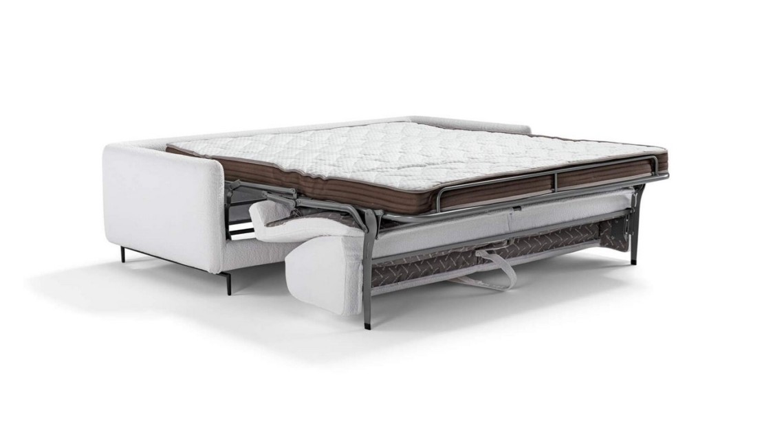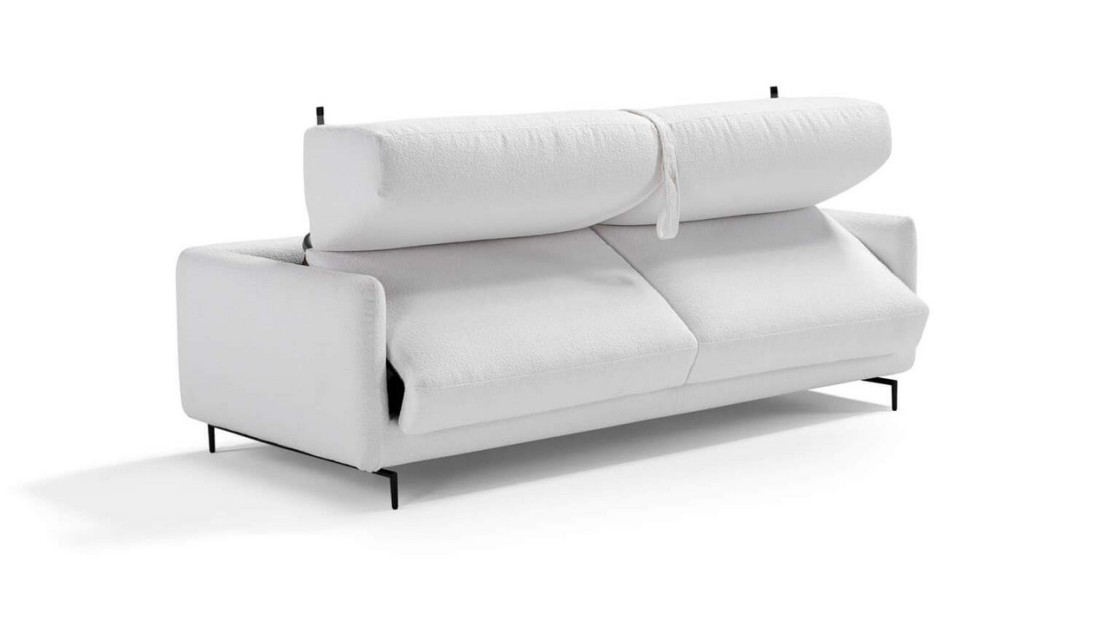 Élégant & design, canapé exclusivement MINIMAL en tissu convertible, confort couchage quotidien avec son matelas de 13 cm d'épaisseur au choix, petits accoudoirs compacts, pieds design en métal teinte au choix, proposé également en 2 autres dimensions & sans convertible.