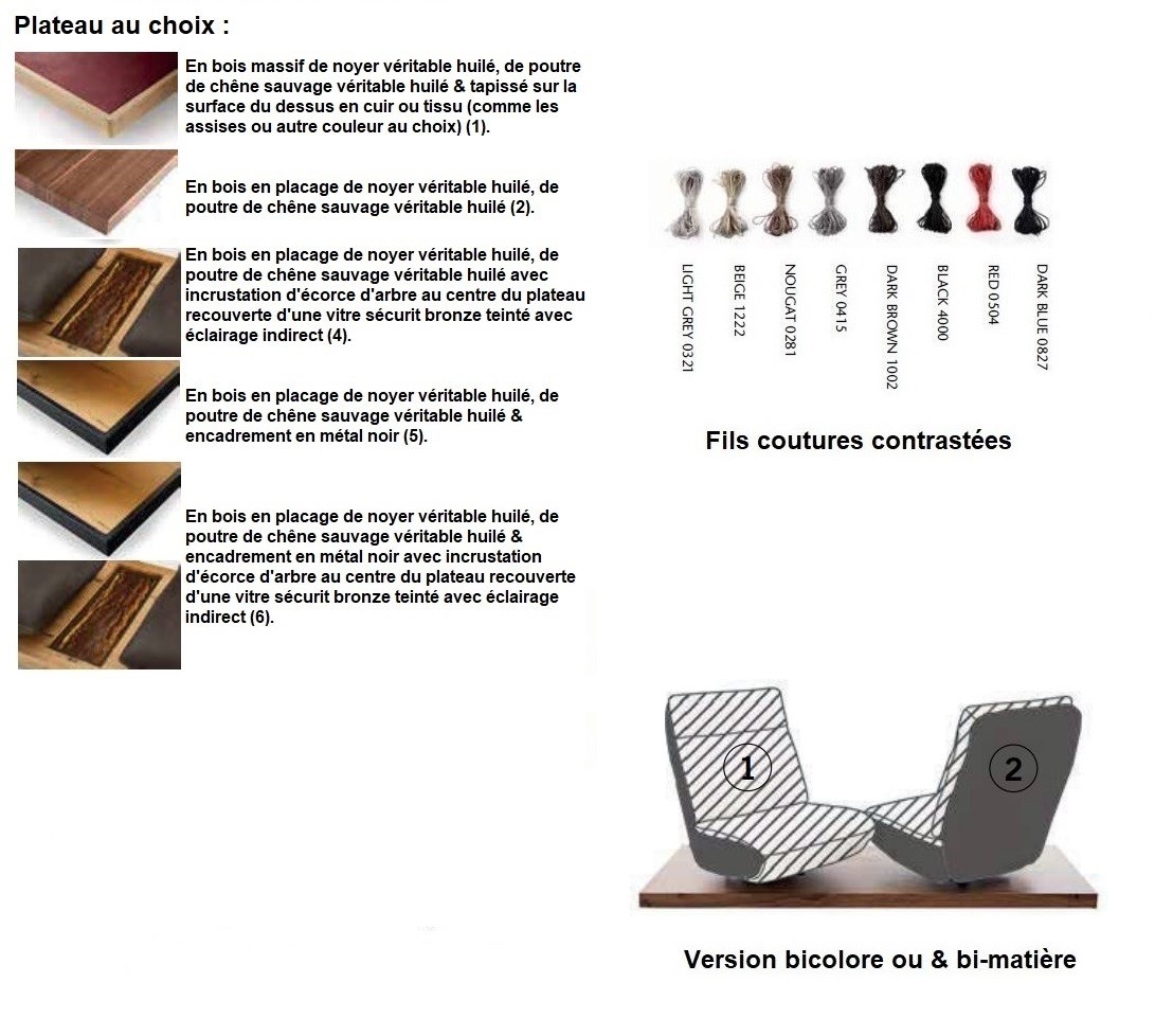 Lors de votre commande, après vous être enregistré, veuillez préciser dans la rubrique « nous laisser un message », la teinte ou les teintes choisies des revêtements, cuir ou tissu ou cuir & tissu, en version unie ou bicolore (revêtement 1 intérieur, assise et dossier et 2 extérieur, dos, dessous d’assise et côtés), le choix du fil des coutures pour le cuir (ton sur ton ou contrasté) le choix du plateau ainsi que sa finition, le panel de contrôle argent ou noir.