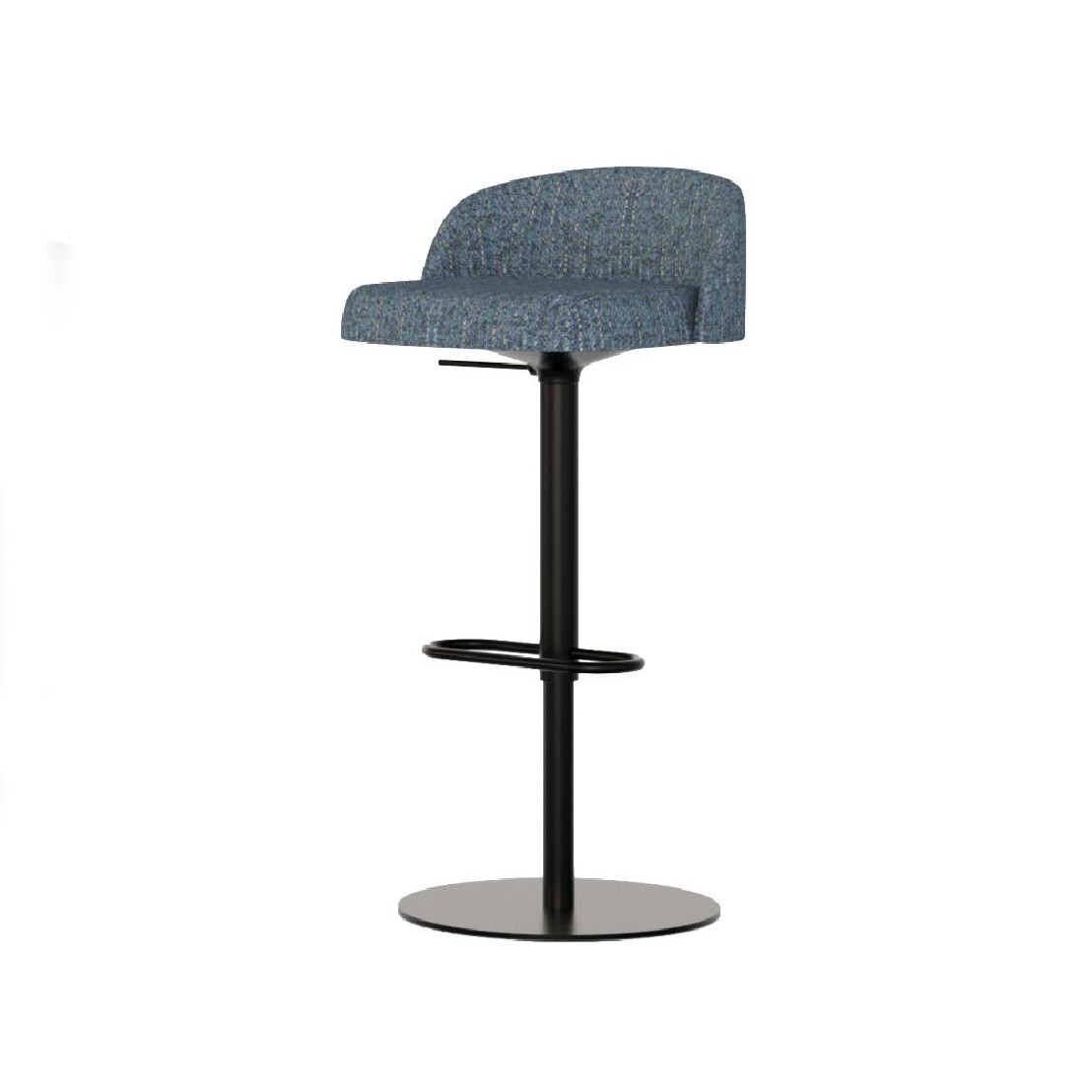 Base ronde, colonne et repose-pieds en acier chromé CR, ou blanc Bl, noir NE, taupe BG, vert olive VO, cuivre CB, marron TB, jaune moutarde SE, bleu BL, gris soie GS, ivoire SB, peinture poudre époxy avec traitement haute résistance aux rayures, réglable en hauteur de 60 à 80 cm.